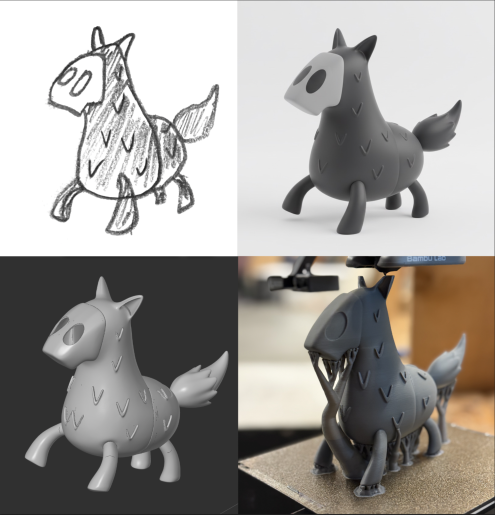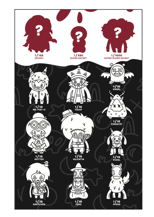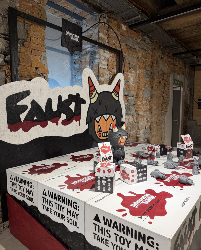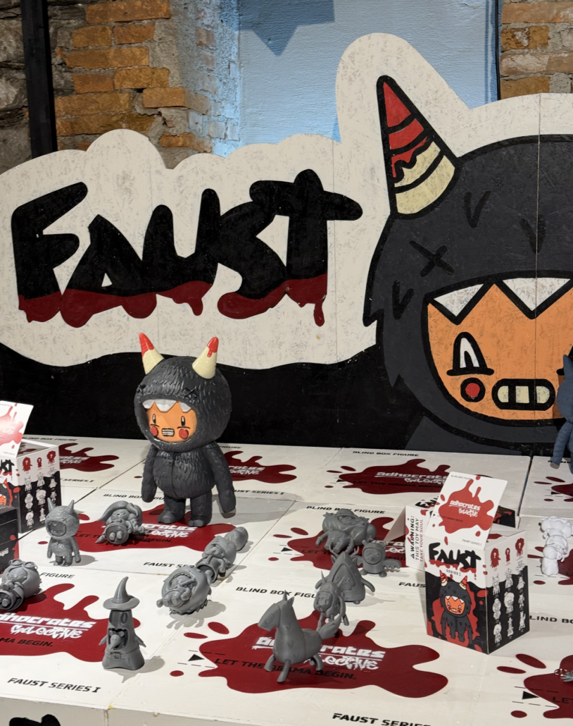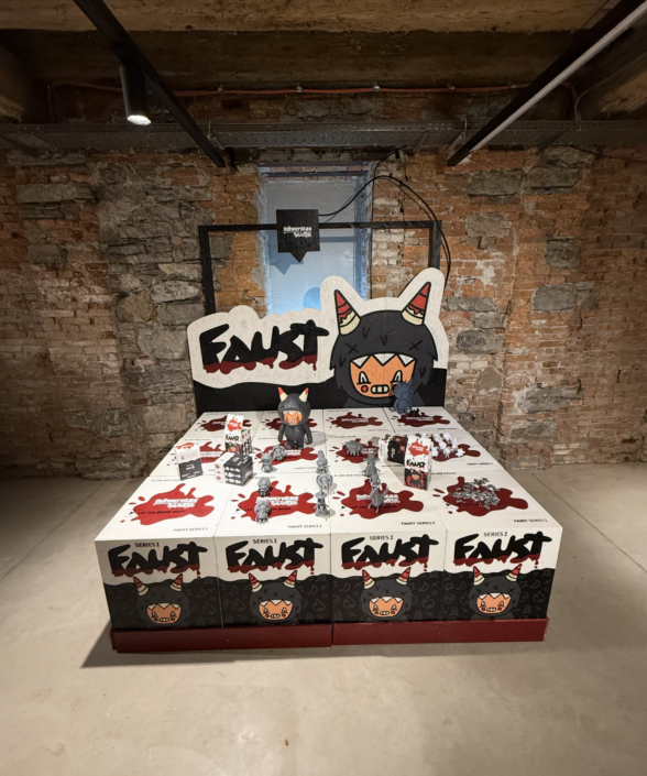 We created a workflow from simple sketches via AI tools to 3D print a series of toys, characters from Faust. The final setup was a supersized display of blindboxes, resembling a shop shelf.