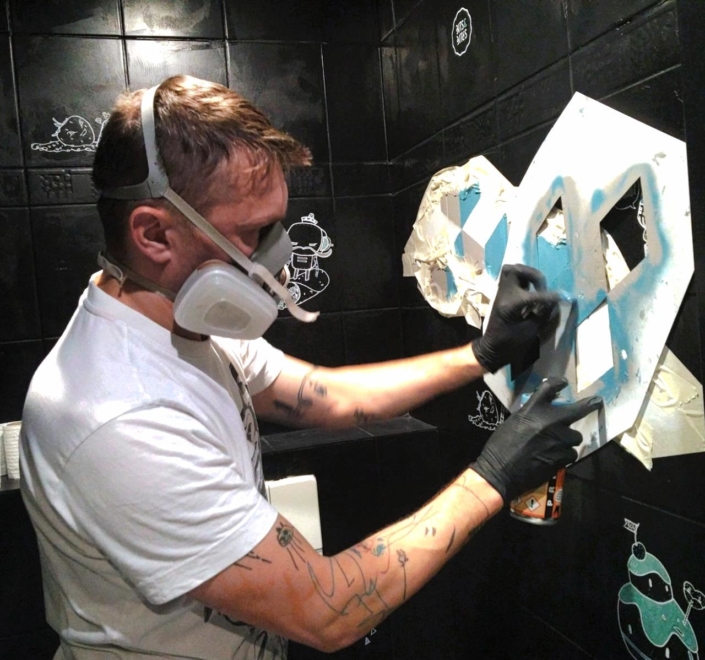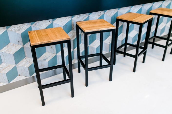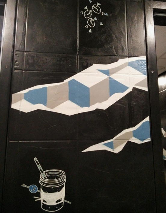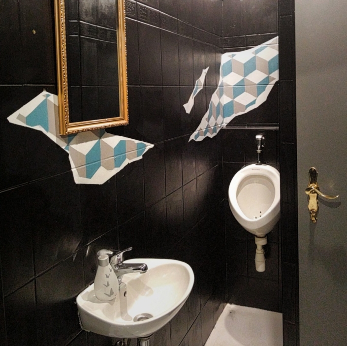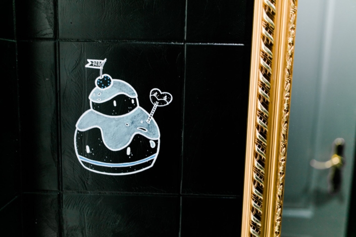 The new restaurant in town asked us to paint the bathrooms, we came up with the idea to tweak the wood pattern used on their counter and mix it with characters!