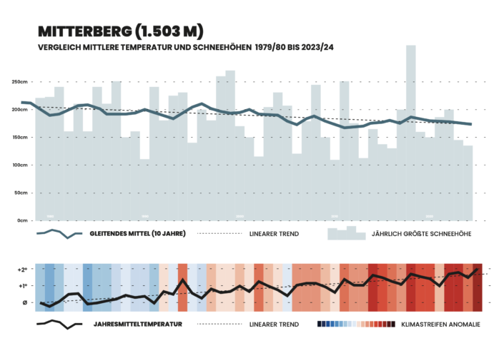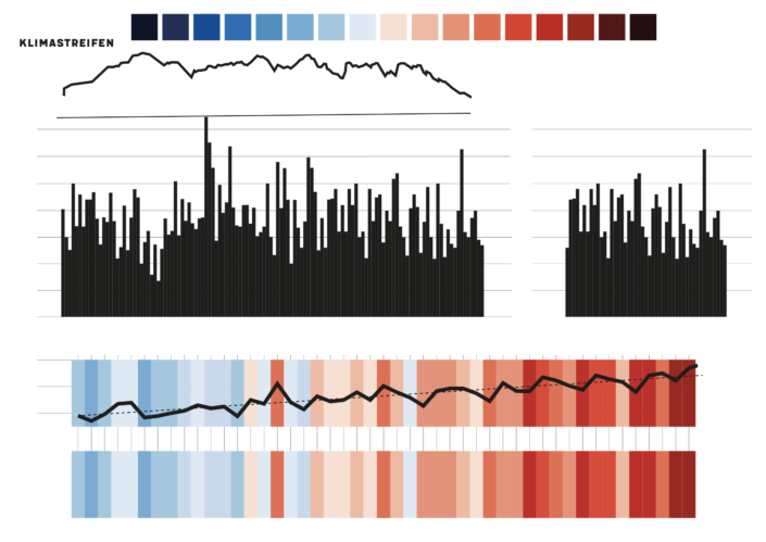 It includes climate stripes based data collected since 1900 at Arthurhaus, the so called Ombormeter Rapporte, mixed with the iconic Mandlwand outline. Plus we added some illustrations and the newly created mascot „Keili“.